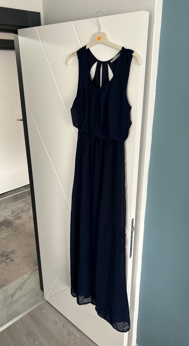 uzun elbise, drapeli tasarım, yüksek yakalı ve bol kesimdir. Sentetik kumaştan yapılmış, minimalist gotik tarzı ve romantik akşamlar için uygundur. Hamile elbisesi olarak da kullanılır