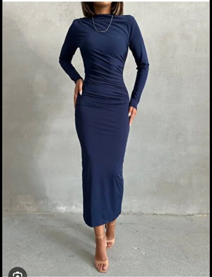 Lacivert Uzun Drapeli Ofis Elbisesi