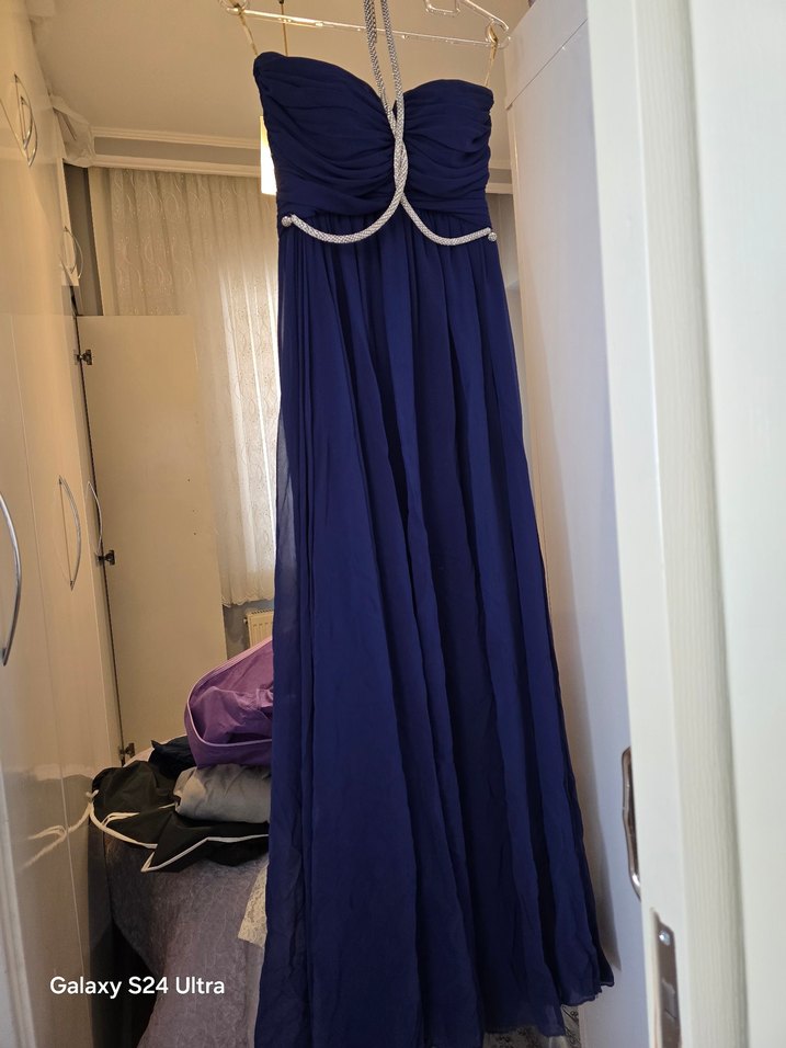 Lacivert uzun, drapeli ve straplez yakalı abiye elbise, düğün ve özel günler için şık bir seçim. ✨