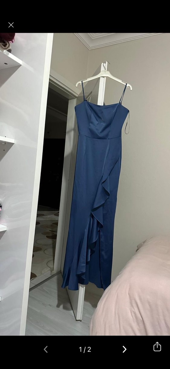Lacivert Uzun Drapeli Straplez Abiye Elbise