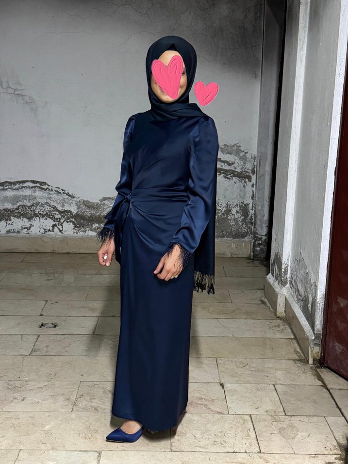 Lacivert Uzun Drapeli Tesettür Abiye Elbise