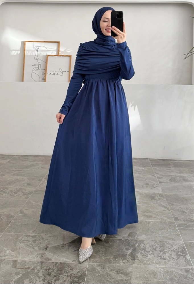 Lacivert uzun elbise, drapeli detaylı, yüksek yakalı ve uzun kolludur. Rahat kesimi ve sentetik kumaşıyla sade ve modern bir tarz sunar.