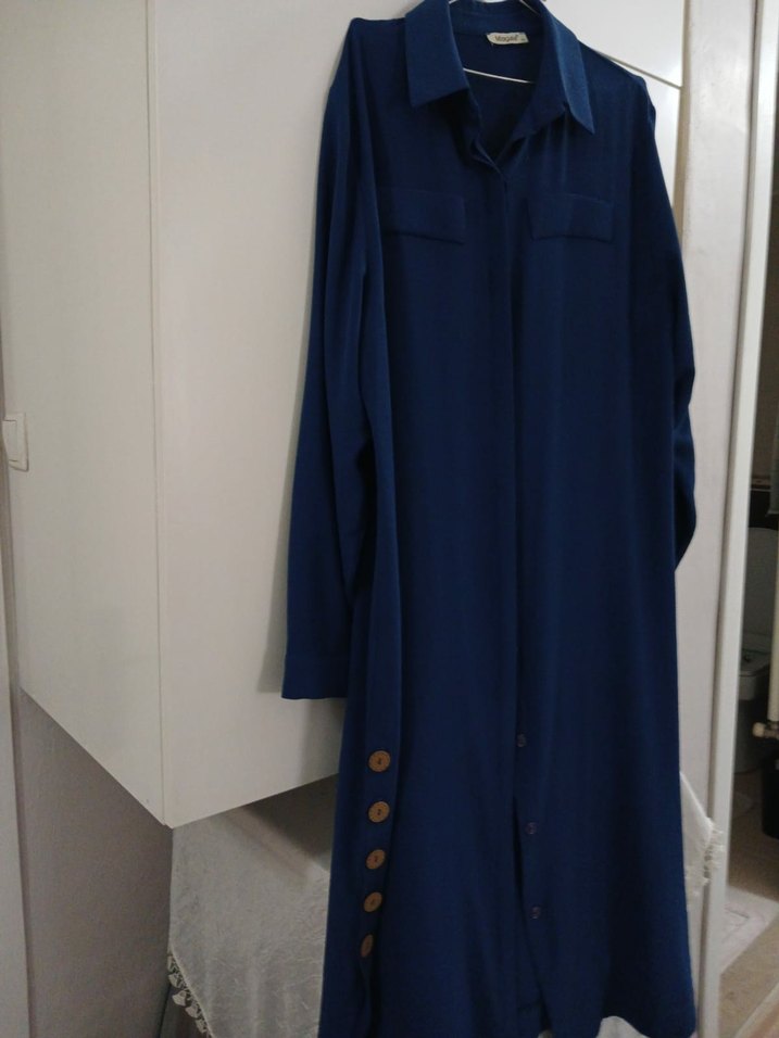 Lacivert uzun yazlık kap düğmeli ve cep detaylıdır. Salaş kesimi ve klasik yaka tasarımıyla minimal ve günlük kullanıma uygundur.boy 124 iki kol arası 62 cm dir