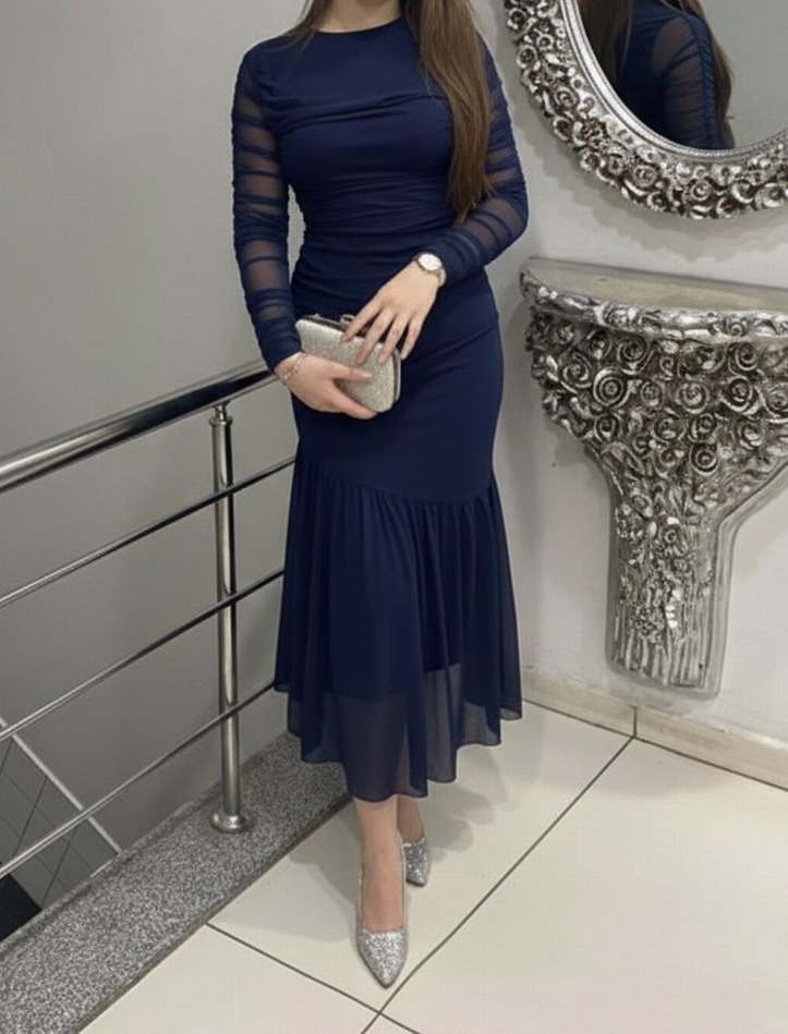 Lacivert uzun elbise, fitted kesim ve pile detaylıdır. Kayık yaka ve ince askılı tül kollara sahiptir. Pürüzsüz sentetik kumaştan üretilmiştir.1 defa giyildi sorunsuzdur 40 42 beden uyumludur ✨