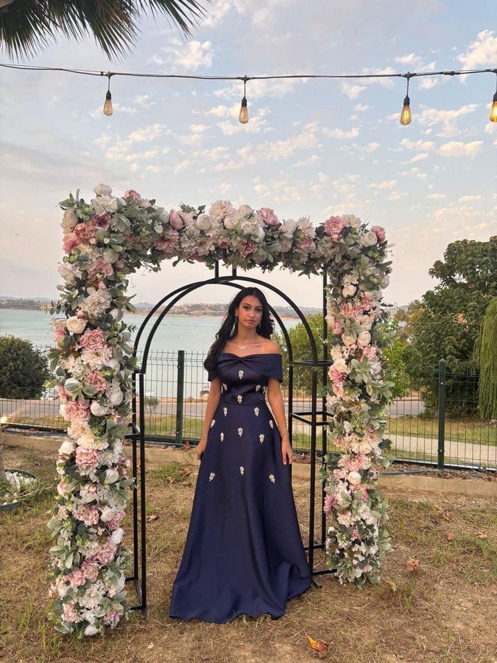 Nakış işlemeli, lacivert uzun abiye. Drapeli tasarım, regular fit ve klasik zarafet ile bohem stili bir arada sunar. Normalde 38 beden ama ben daralttım isteyen açtırabilir.