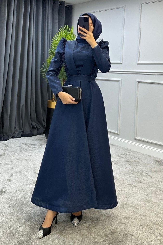 Lacivert uzun abiye elbise, tüylü yakası çapraz kesimli detaylıdır. Uzun kollu, modern