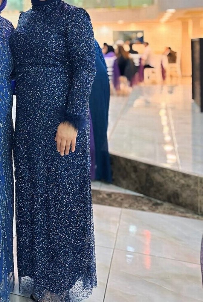 Parlak lacivert kumaştan, kollarında kürk detaylı, kesimi vücuda oturan uzun abiye elbise. Notlu yaka ve uzun kolludur, düğünler için uygundur. ✨