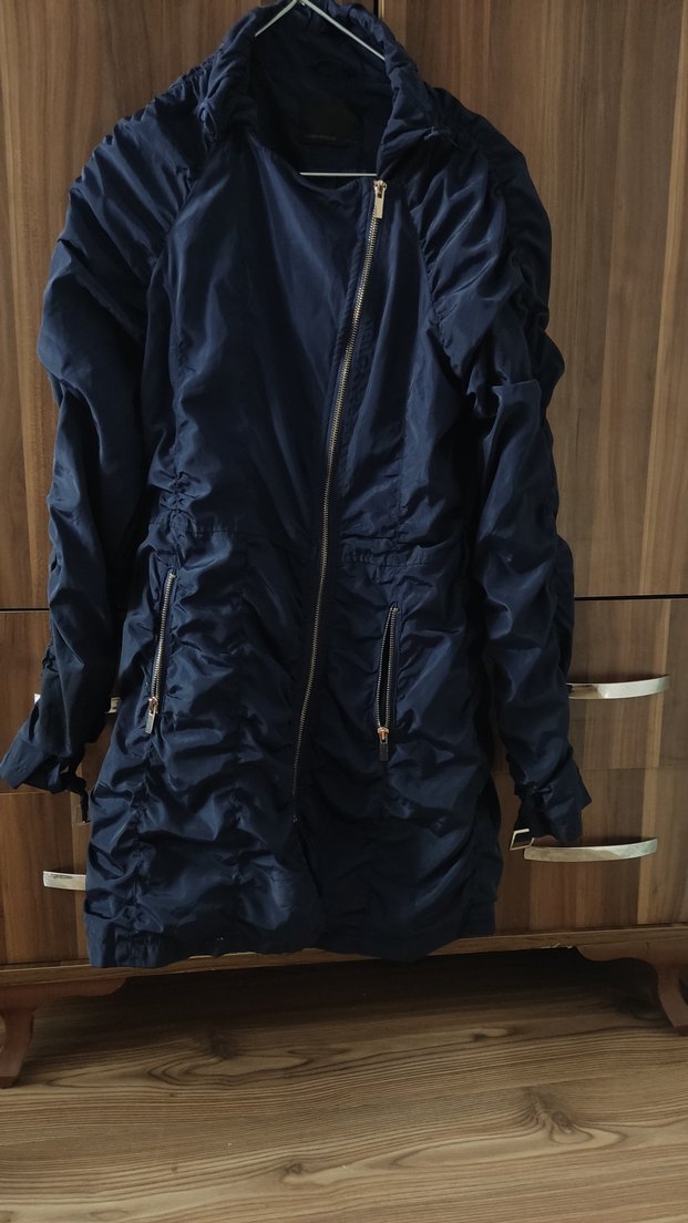 Lacivert renkli, uzun kollu, fermuarlı ve dar kesim kadın ceketi. Sentetik kumaştan üretilmiş, sokak stiline uygun şık bir tasarım. bir iki kere az giyildi defosu yoktur