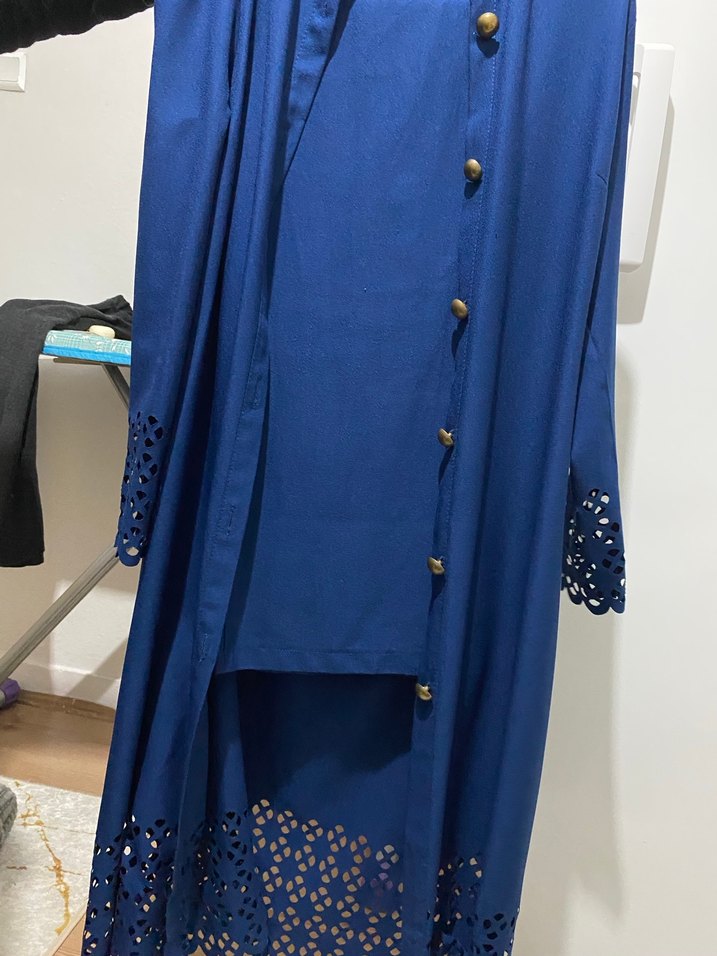 Lacivert renkli, uzun ve regular kesim kadın elbise, uzun kollu ve minimal bohem tarzında. Manşet ve etek kısmında dekoratif kesik detayları ve düğmeli kapama bulunur.