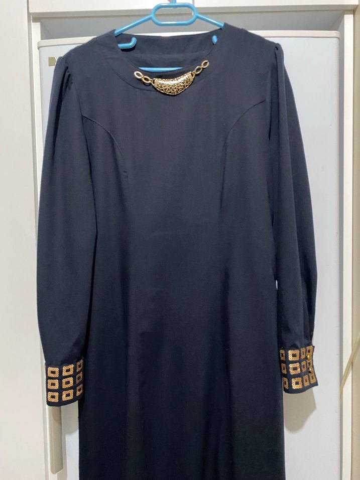 Lacivert uzun elbise, bisiklet yaka ve uzun kollu, işlemeli manşetlere sahiptir.