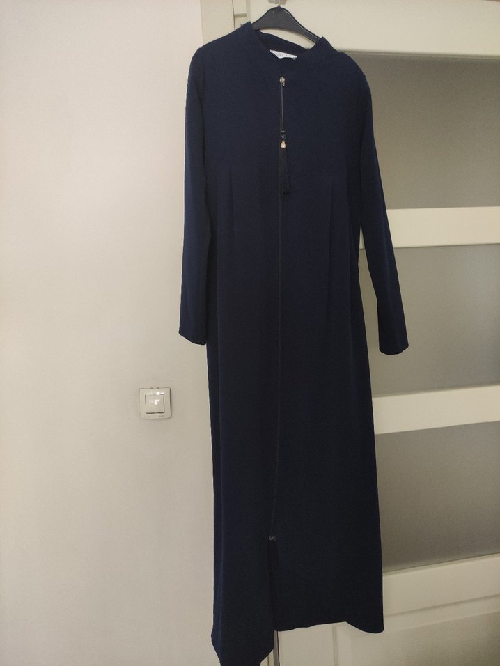 Lacivert uzun kadın kaban, fermuarlı, uzun kollu ve yırtmaçlıdır. Sentetik kumaştan, günlük kullanıma uygundur.