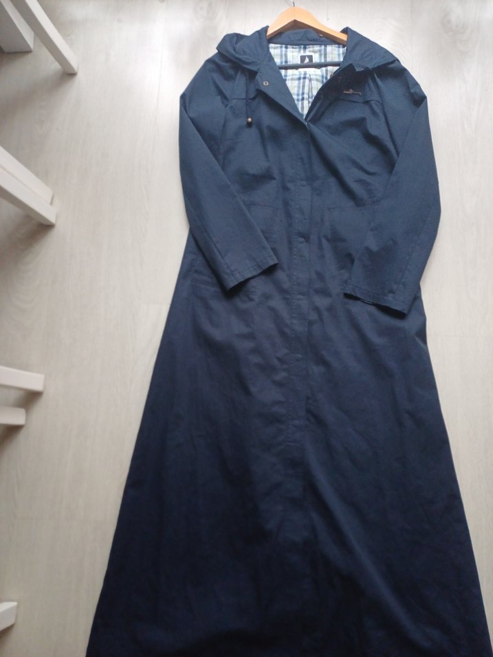 Lacivert uzun kadın kaban, düğmeli ve notched yakalıdır. Sentetik kumaştan üretilmiş, uzun kollu ve minimal tasarıma sahiptir. Günlük kullanıma uygundur. kapşollu 130 boydadır 3 kez anca giyildi