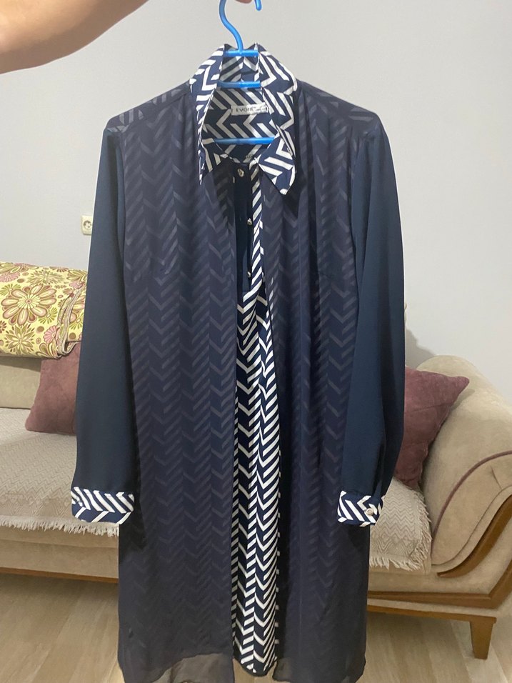Uzun kollu, yaka detaylı ve pileli lacivert tonlarında batik desenli tunik, ofis ve günlük şıklık için uygundur. ✨
