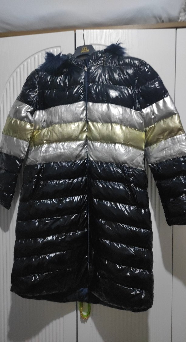 Fermuarlı, uzun ve dar kesim kadın kışlık ceket, kürk detaylı yaka ve siyah, gümüş ile altın renk bloklarıyla sokak stiline uygun. 38 beden boy: 93cm omuz:38 cm şişme mont