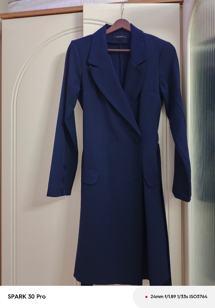 Lacivert uzun elbise, iş ortamları için düğmeli ve regular fit kesime sahiptir. Yumuşak ve sıcak kumaştan üretilmiş, uzun kolludur ve desensizdir.
