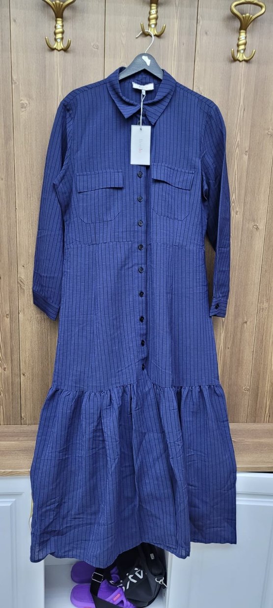 Lacivert renkte, keten kumaştan, uzun kollu ve pilili detaylara sahip, günlük kullanıma uygun rahat kesim uzun elbise. sıfırdır