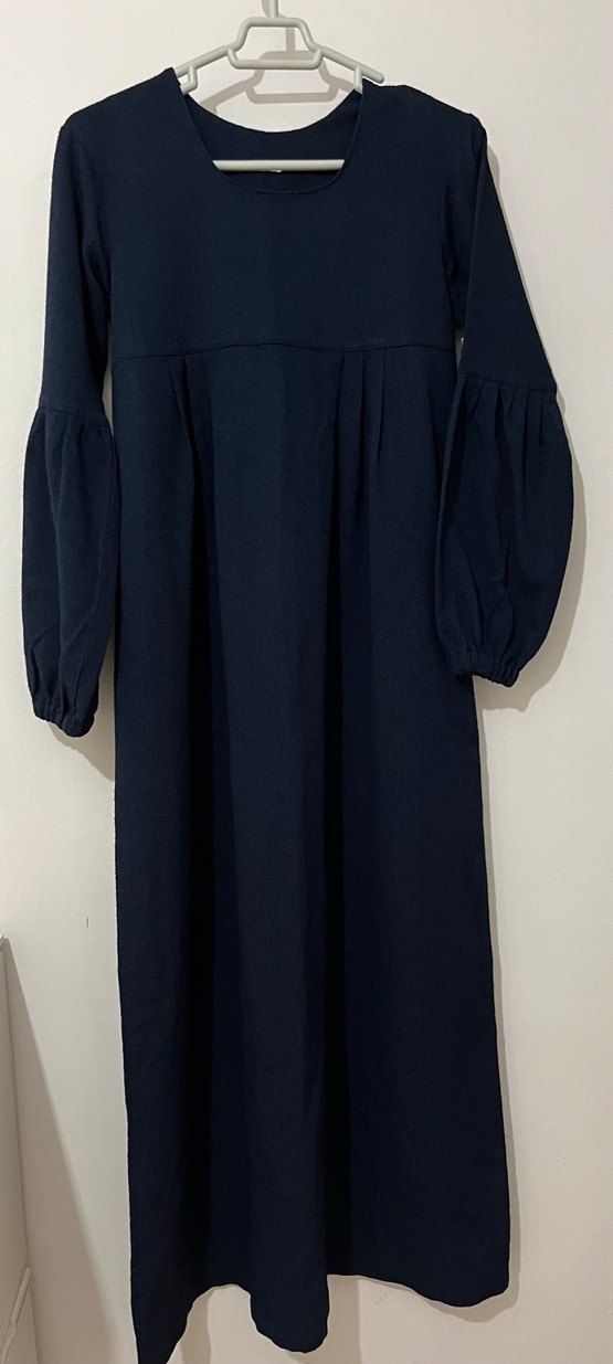 Lacivert uzun keten elbise, pilili, yüksek yakalı ve uzun kolludur. Bol kesimi ve sade tarzıyla günlük kullanıma uygundur. Kışlık robalı elbise