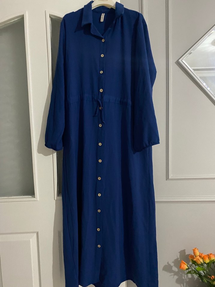 Lacivert renkte, keten kumaştan yapılmış, düğmeli ve yakalı uzun kol gömlek elbise. Bol kesimi ve sade tarzıyla günlük kullanıma uygundur.