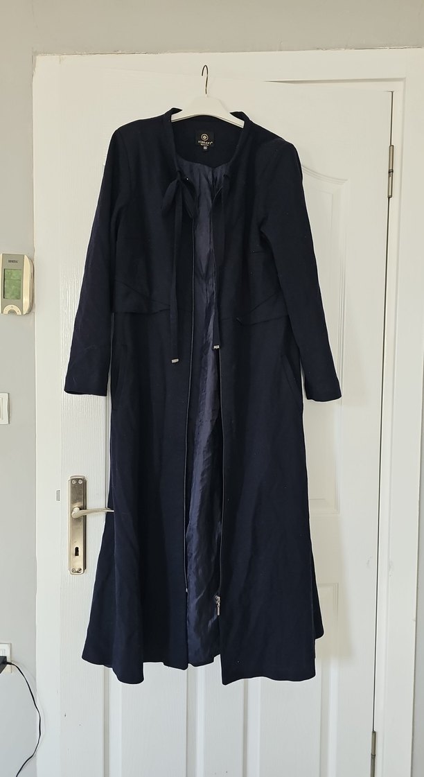 Lacivert uzun keten kaban pardesü, yakalı ve drapeli tasarıma sahip, klasik zarafetle ofis için uygun, regular fit ve uzun kolludur. belden oturmalı medine etek modelinde etek kısmı
