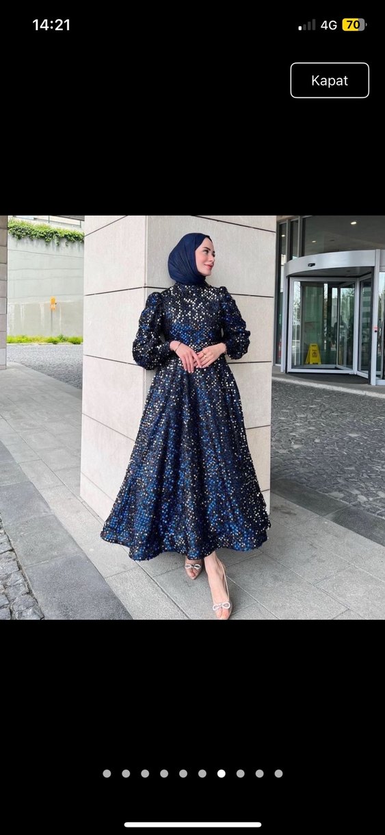 Lacivert uzun kol, yüksek yakalı, bol kesim drapeli elbise. Koyu tonlu batik deseniyle düğünler için uygun. Tek kusuru pulları ara ara renk atması var gözle belirgin değildir . Sırıtmıyor