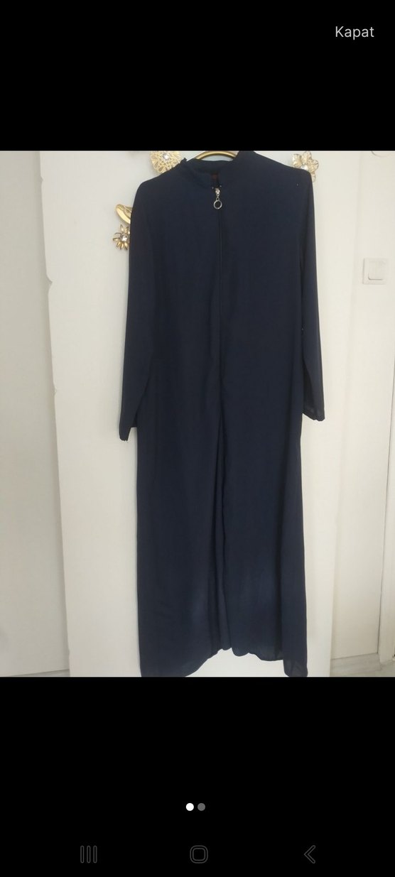 Lacivert uzun elbise, bol kesim, ferace günlük kullanıma uygundur.