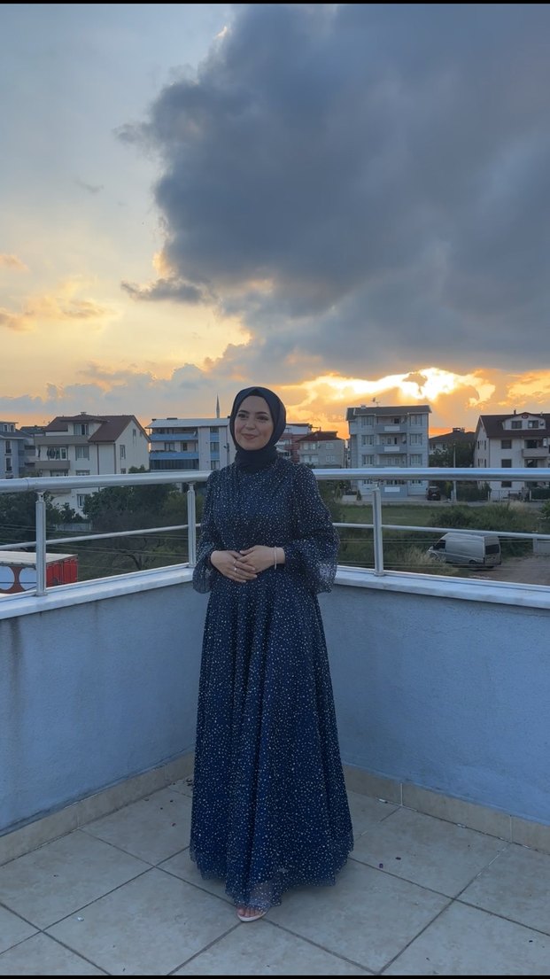 Lacivert Uzun Kol Drapeli Tesettür Elbise