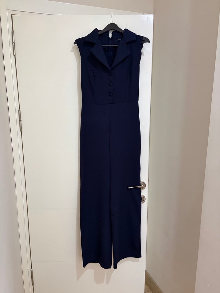 Lacivert uzun tulum, kırlangıç yaka ve kemerli bel detayına sahiptir. Regular fit ve kolsuz tasarımıyla ofis için minimalist bir sokak stili sunar.