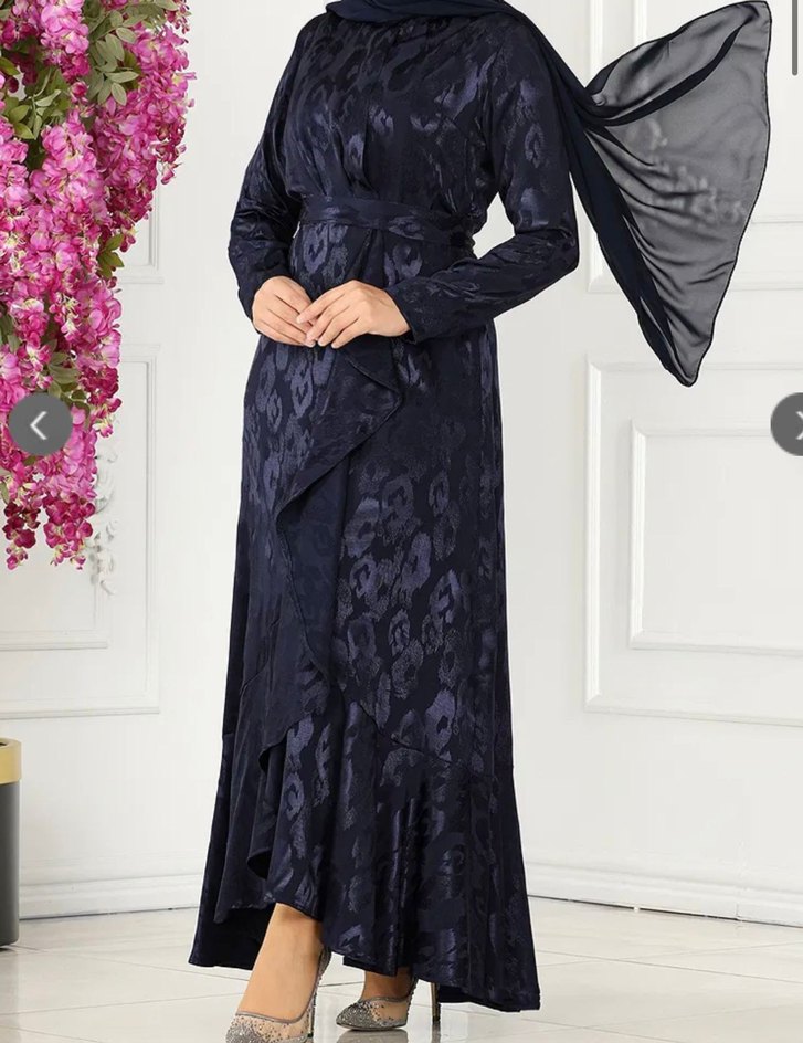 Lacivert uzun kollu, bağlamalı ve salaş kesimli abiye elbise. Notlu yaka ve ince bağlamalı detaylar içerir, ofis için uygundur. modaselvim marka 38 40 beden olur