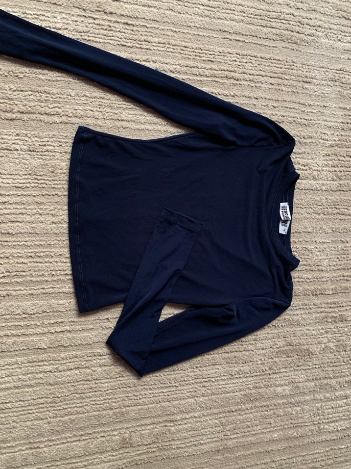 Lacivert renkli, uzun kollu, bluz . Düz ve sokak stiliyle günlük kullanıma uygun, sentetik kumaştan üretilmiştir.