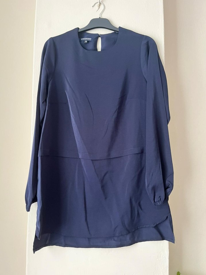 Lacivert renkte, uzun kollu, yuvarlak yakalı ve normal boyda bol kesim bluz. Yumuşak polyester kumaştan, sade ve desen içermeyen tasarıma sahiptir. Etiketi yok ama yenidir kullanılmamıştır. Fotoğraftaki beden etiketine takılmayın lütfen yanlış dikilmiş olup 40 beden için uygundur ve bol kesime sahiptir.