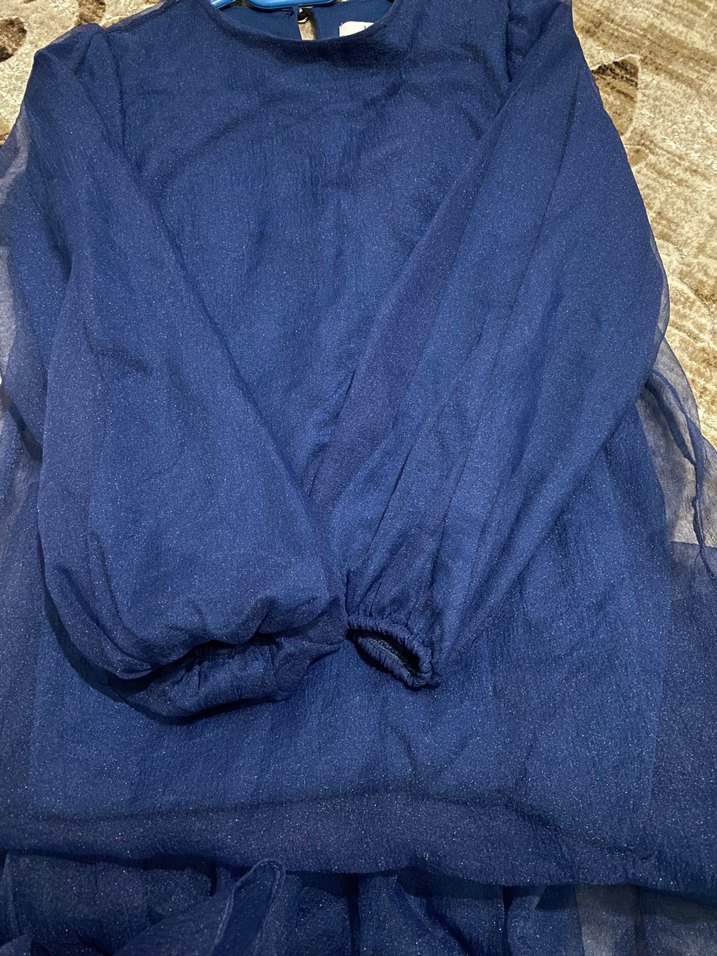 Lacivert renkli, yüksek yakalı ve uzun kollu bu uzun elbise, bol ve drapeli kesime sahiptir. Hafif sentetik kumaştan üretilmiş, minimalist ve bohem tarz sunar. Kendinden simli ve parıltılıdır, simleri dökülmez. İçinde aynı renk astar vardır. Kolları balon şeklindedir, kemeri de mevcuttur. Hiçbir deformesi yoktur. 36 bedendir. Ürün boyu 132 cm, iki kol arası 45 cm, kol boyu 50 cm