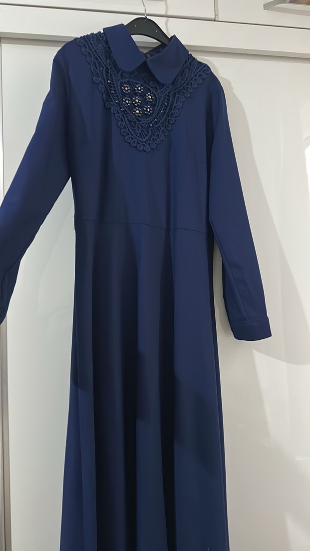 Lacivert uzun kollu, yakalı elbise, göğüs kısmında dantel işlemeli detaylara sahiptir. Rahat kesimli, sentetik dokulu kumaştan üretilmiştir, ofis için uygundur.