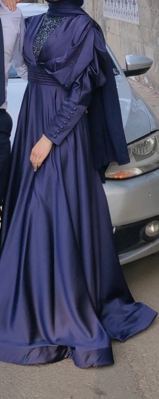 Lacivert renk, uzun kollu, yakası kesimli, drape detaylı klasik ve sade abiye elbise. Düz kesimli, uzun boyda ve modest tarzda, düğünler için uygun. boyunda kısaltma olmuştur isteyene ölçü verebilirim