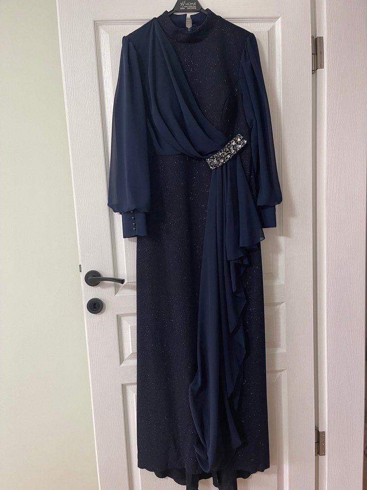 Lacivert renkte, uzun kollu ve yüksek yakalı, bol kesim drapeli abiye elbisedir. Dekoratif toka detayına sahiptir, düğünler için uygundur. ✨ hiçbir defosu yoktur.