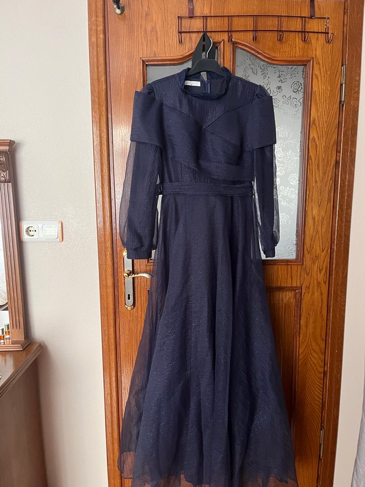 Lacivert renkte, uzun kollu ve drapeli tasarıma sahip bu uzun abiye elbise, klasik zarafeti gotik dokunuşla birleştirir. Düğünler için uygundur şalı ile beraber satılmaktadır