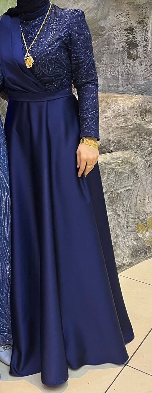 Yüksek yakalı, uzun kollu lacivert uzun abiye elbise, drapeli tasarıma ve sade, düzenli kesime sahiptir. Düğünler için uygun.