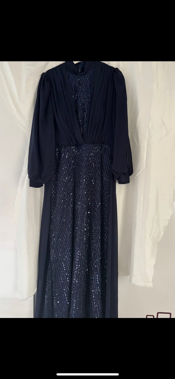 Lacivert uzun kollu, yüksek yakalı ve bol kesimli drapeli abiye elbise. Düğünler için şık bir model herhangi bir sorunu yoktur bir kere kullanıldı 42-44 bedene uygundur