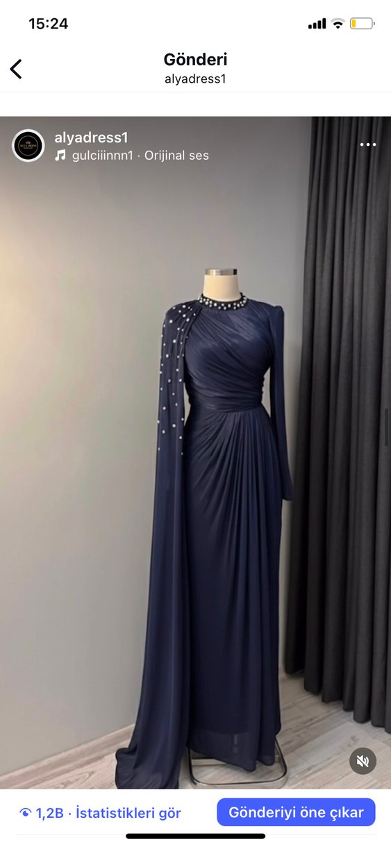 Lacivert uzun kollu, yüksek yakalı abiye elbise, drapeli detaylar ve nakışlı desenlere sahiptir. Modern klasik tarzda, düğünler için uygundur.