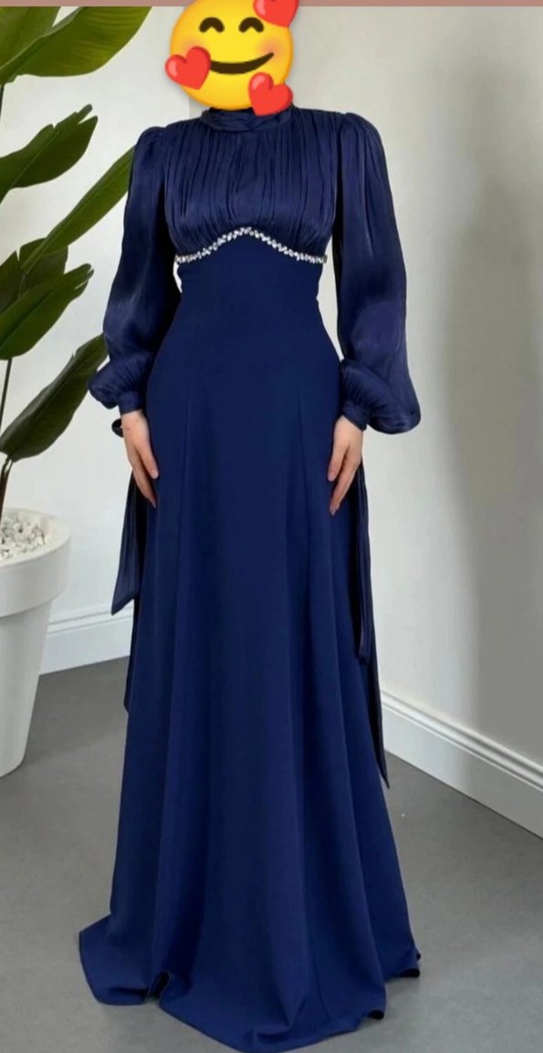 Lacivert Uzun Kollu Drapeli Abiye Elbise+ Şalı