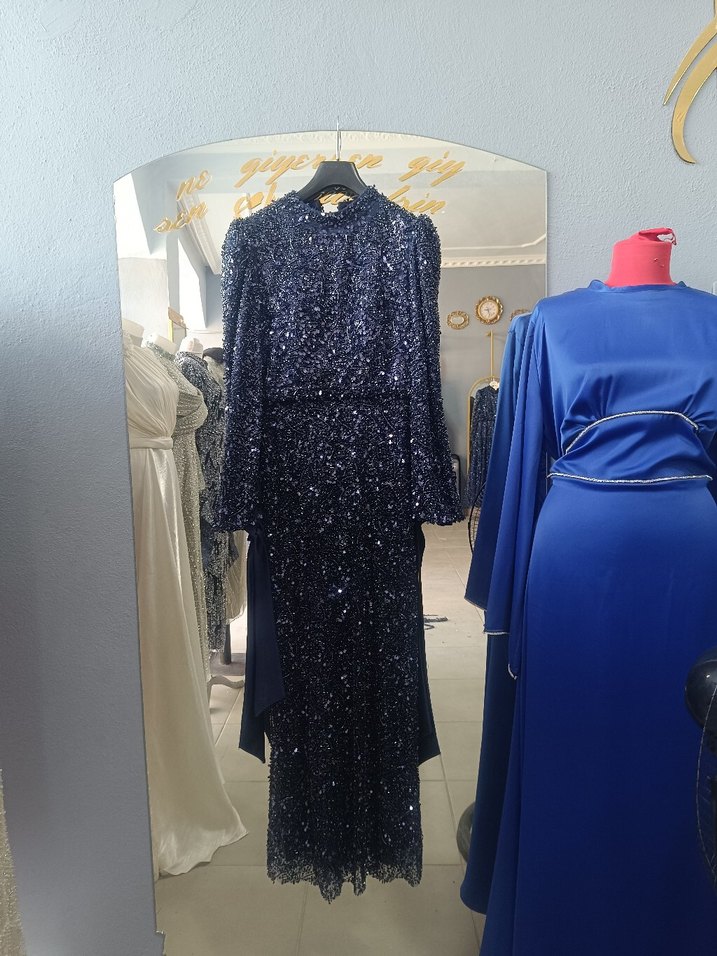 36-38 uyumludur Lacivert, uzun kollu, yüksek yakalı, drapeli ve desenli uzun abiye elbise. Düzenli kesimiyle düğün ve özel davetler için uygundur. ✨