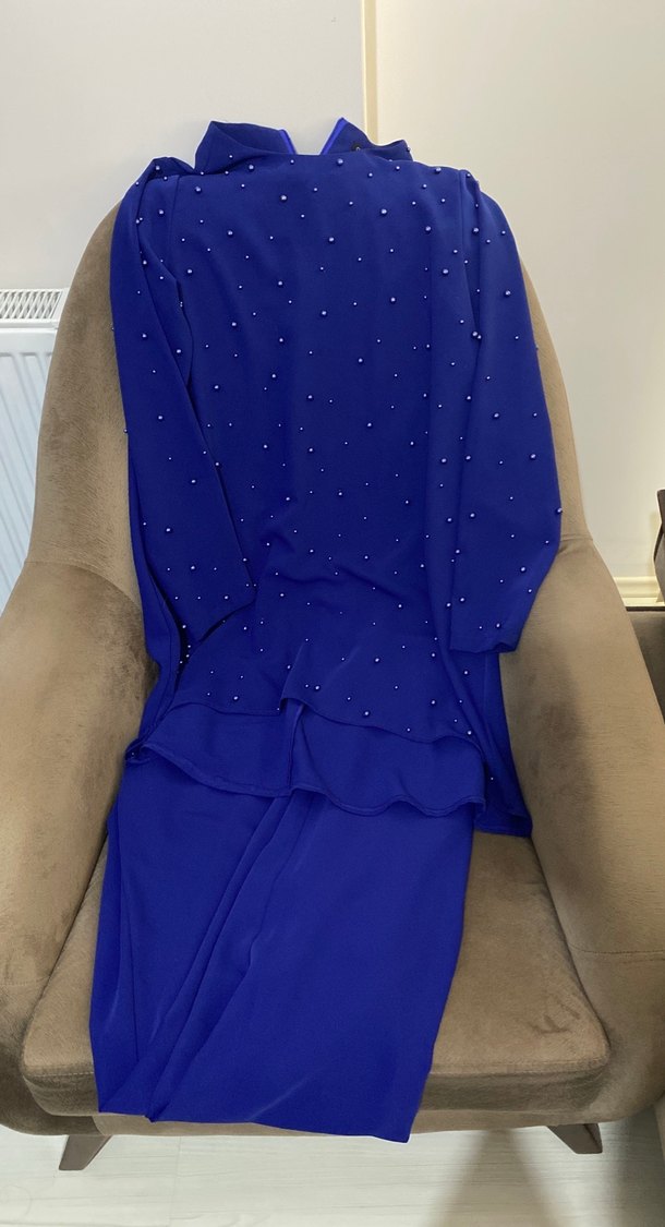 Lacivert uzun kollu, yakalı ve drapeli tasarıma sahip abiye elbise, klasik ve çağdaş tarzı yansıtır. Düğün için uygun, sade ve şık bir modeldir.