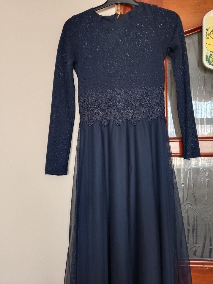 Lacivert uzun kollu, drapeli ve bel kısmı dantel detaylı, klasik kesim abiye elbise. Düğün gibi özel anlara uygundur.