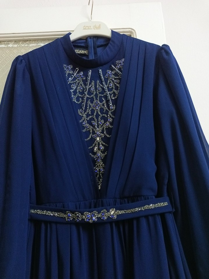 Lacivert renkte, uzun kollu, yüksek yakalı ve bol kesim abiye elbise. Drapeli detayları ve kemerli bel kısmı ile düğünler için uygun.
