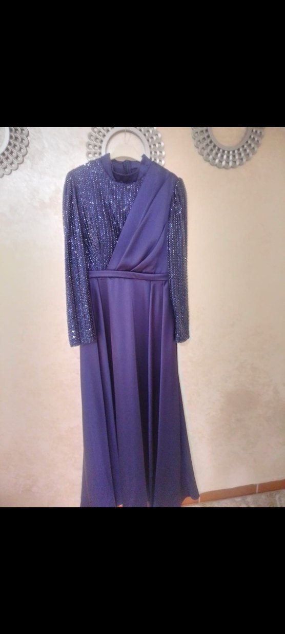 lacivert renkte, uzun kollu ve yüksek yakalı bu uzun abiye elbise, drapeli tasarımı ve düzenli kesimiyle modern klasik stil sunar. Düğünlere uygundur.bir kez 3 saatliğine giyildi