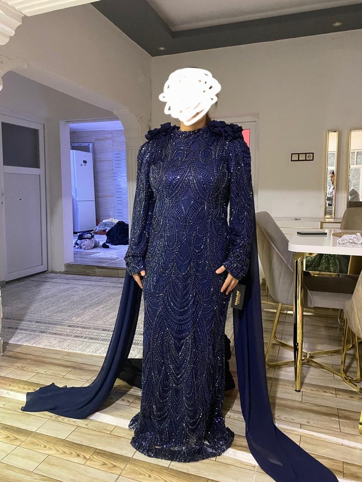 Lacivert Uzun Kollu Drapeli Abiye Elbise sifir urun 42 44