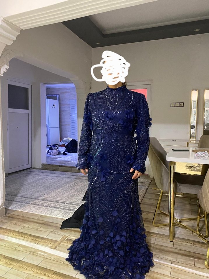 Bu lacivert uzun abiye elbise, yüksek yakalı ve uzun kolludur. Drapeli ve desenli yapısıyla düğün gibi özel anlar için uygundur.