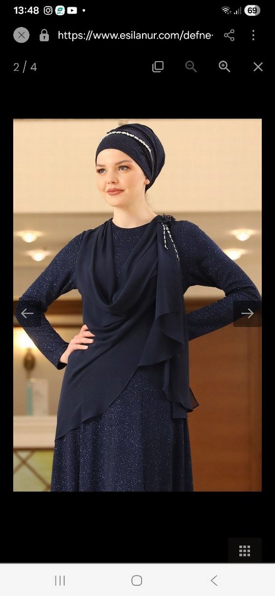 Lacivert renkte, uzun kollu ve yüksek yakalı, drapeli detaylı, modern ve modest tasarımlı uzun abiye elbisedir. ✨
