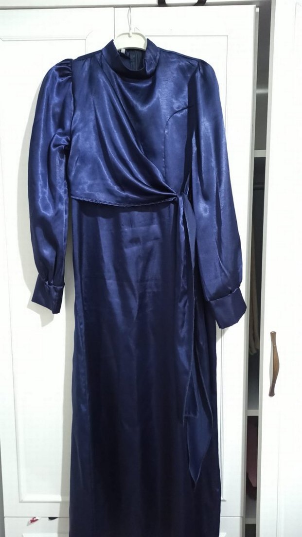 Lacivert renkte, yüksek yakalı ve uzun kollu bu kadın elbisesi, belinde drapeli detaylarla modern klasik bir tarz sunar. Ofis için uygun, düzenli kesim ve desensiz kumaşı Paris esintili şıklık taşır. ✨ Tadilat işlemi gördü ablam kendi zevkine göre yaptırdı. 36-38 bedene uygundur
