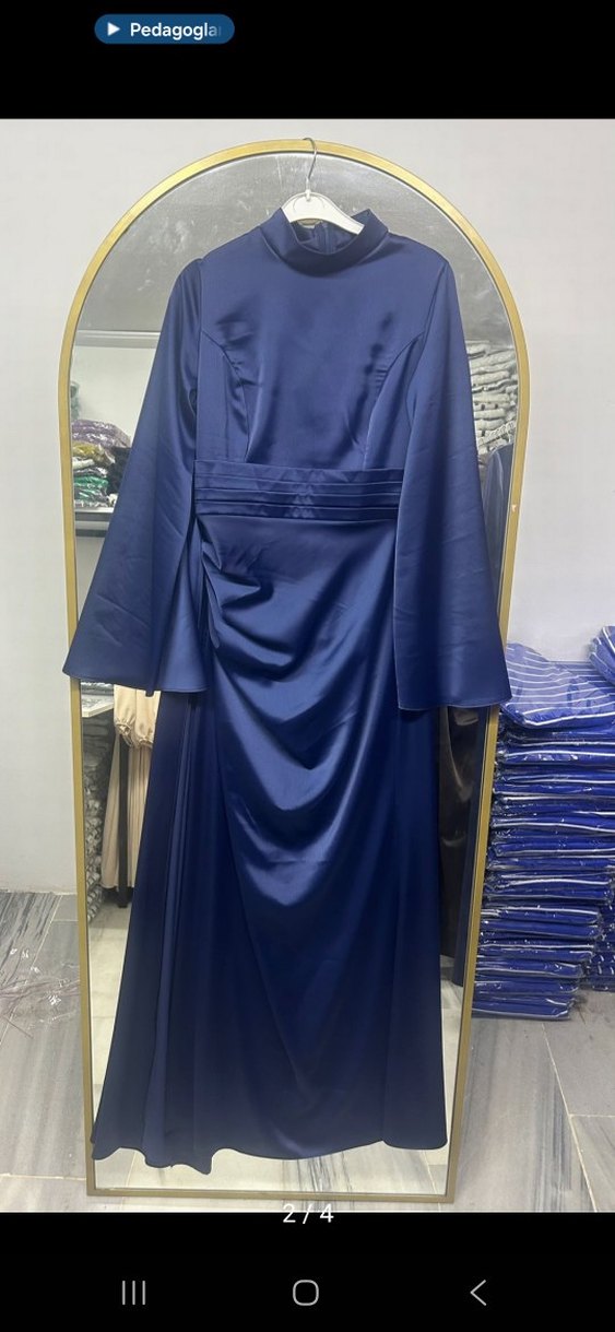 Lacivert uzun elbise, yüksek yakalı ve uzun kollu, drapeli tasarımıyla modern ve klasik bir görünüm sunar. Ofis için uygun, düzenli kesim ve şık siluet sağlar.