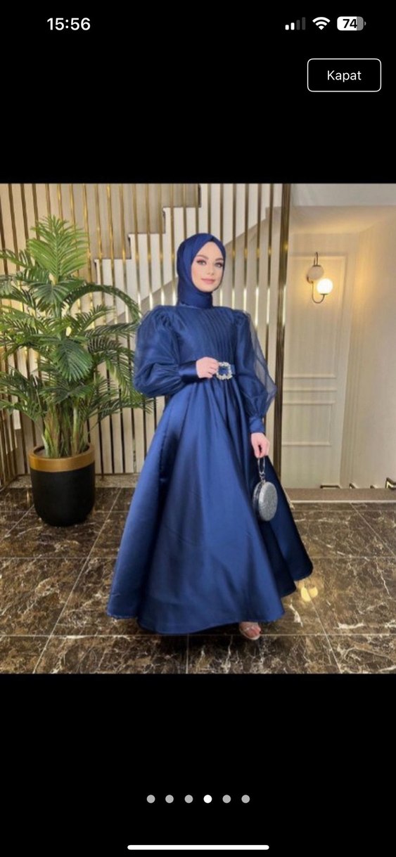 Lacivert uzun kollu, yüksek yakalı ve bol kesimli kadın elbisesi. İpek gibi dokusu ve drapeli tasarımıyla düğünler için uygundur. Modern klasik, parlak ve desensiz görünüm sunar.